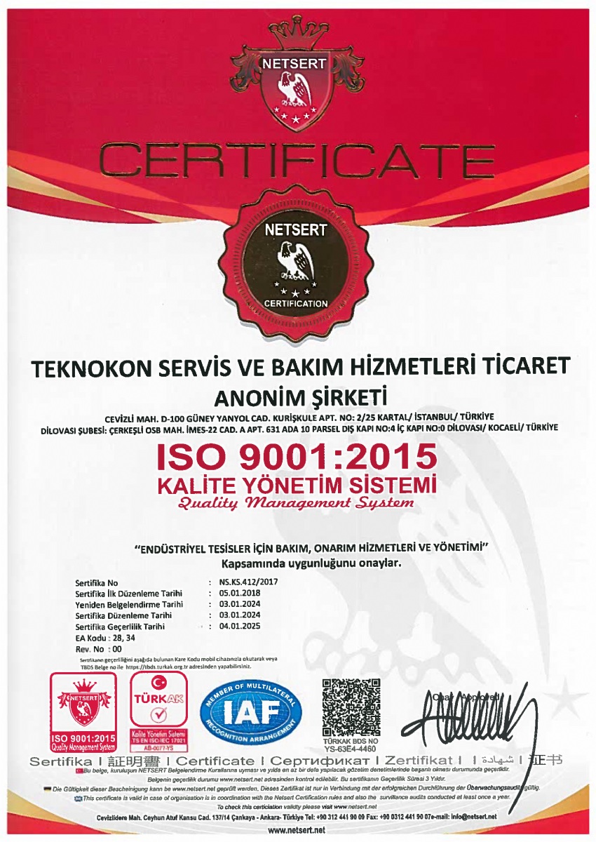 Teknokon Grup şirketleri, ISO 9001 kalite yönetimi sistemi kapsamındaki kalite anlayışını tüm yönetim düzeylerinde benimser ve uygular.